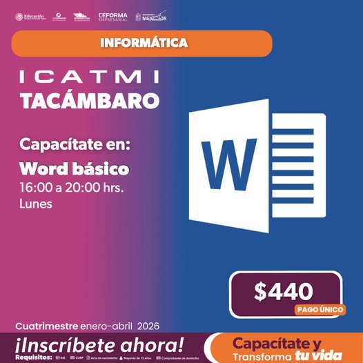 💻📝✨Aprende Word Básico en ICATMI Tacámbaro✨🖥️ 25 DIC. 2025.-¿Quieres mejorar tus tareas, trabajos escolares o documentos laborales? En este curso aprenderás a usar Word desde cero para crear, editar y dar formato a documentos de manera rápida y profesional. Inscripciones abiertas a partir del 5 de enero de 2026 Plantel Tacámbaro https://maps.app.goo.gl/qm1rrV8k2UzQtoXH9 Más información en nuestro Grupo de WhatsApp de Cursos ICATMI: https://chat.whatsapp.com/HnozFaqr8CQFoWs2qQyNdw BOLETIN DE PRENSA