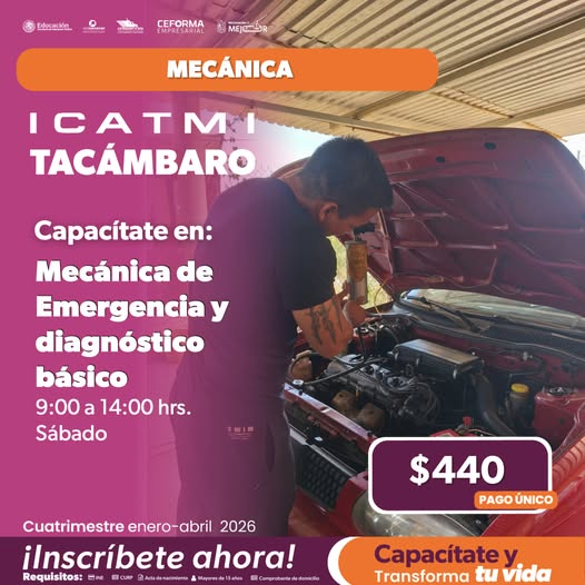 🔧🚗✨Aprende Mecánica de Emergencia y Diagnóstico Básico en ICATMI Tacámbaro✨🚗🔧 2 ENERO 2026.-¿Te gustaría saber qué hacer si tu vehículo falla? En este curso aprenderás a identificar problemas básicos, realizar diagnósticos simples y resolver emergencias mecánicas comunes. Inscripciones abiertas a partir del 5 de enero de 2026 Plantel Tacámbaro https://maps.app.goo.gl/qm1rrV8k2UzQtoXH9 Únete a nuestro Grupo de WhatsApp de Cursos ICATMI para recibir más información y horarios: https://chat.whatsapp.com/HnozFaqr8CQFoWs2qQyNdw REDACCION