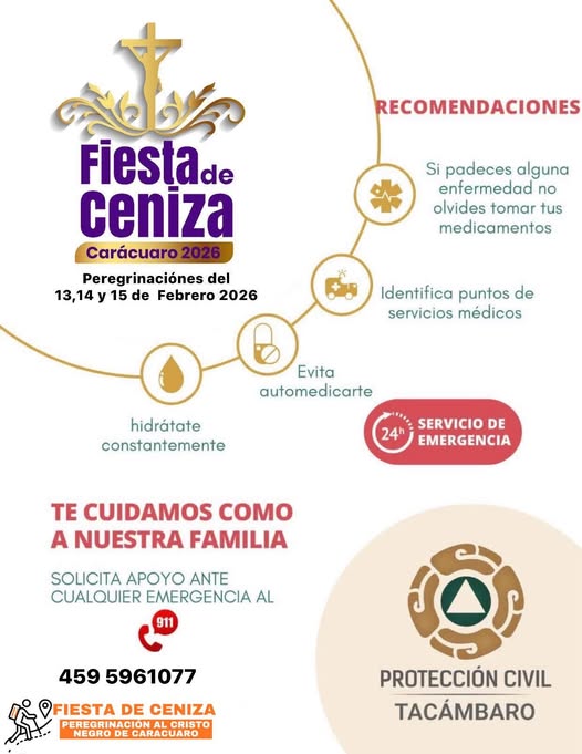 11 feb. 2026.-Este fin de semana daremos inicio con el Operativo Ceniza 2026, mediante el cual se coordinarán acciones interinstitucionales con el objetivo de salvaguardar la integridad de las y los peregrinos que transitan este fin de semana por el municipio de Tacámbaro, los cuales acuden a la fiesta del miércoles de Ceniza al Santuario del Cristo Negro del Municipio de Carácuaro, Michoacán.