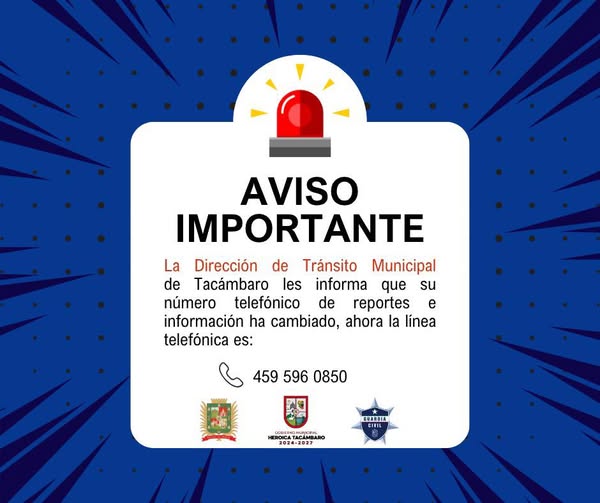La Dirección de Tránsito Municipal de Tacámbaro informa a la ciudadanía que su número telefónico de reportes e información ha cambiado.