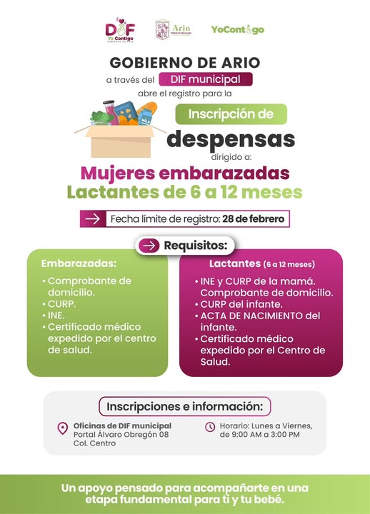 24 FEB. 2026.-El Gobierno de Ario que encabeza la Presidenta Municipal Yohana Mendoza, a través del DIF Municipal, abre el registro para la inscripción de despensas dirigidas a mujeres embarazadas y lactantes de 6 a 12 meses.