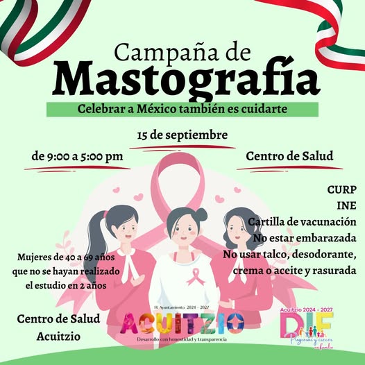 En nuestro municipio se estará realizando una Campaña de Mastografías Gratuitas, porque sabemos lo importante que es cuidar de ti y de quienes más amas. 💖