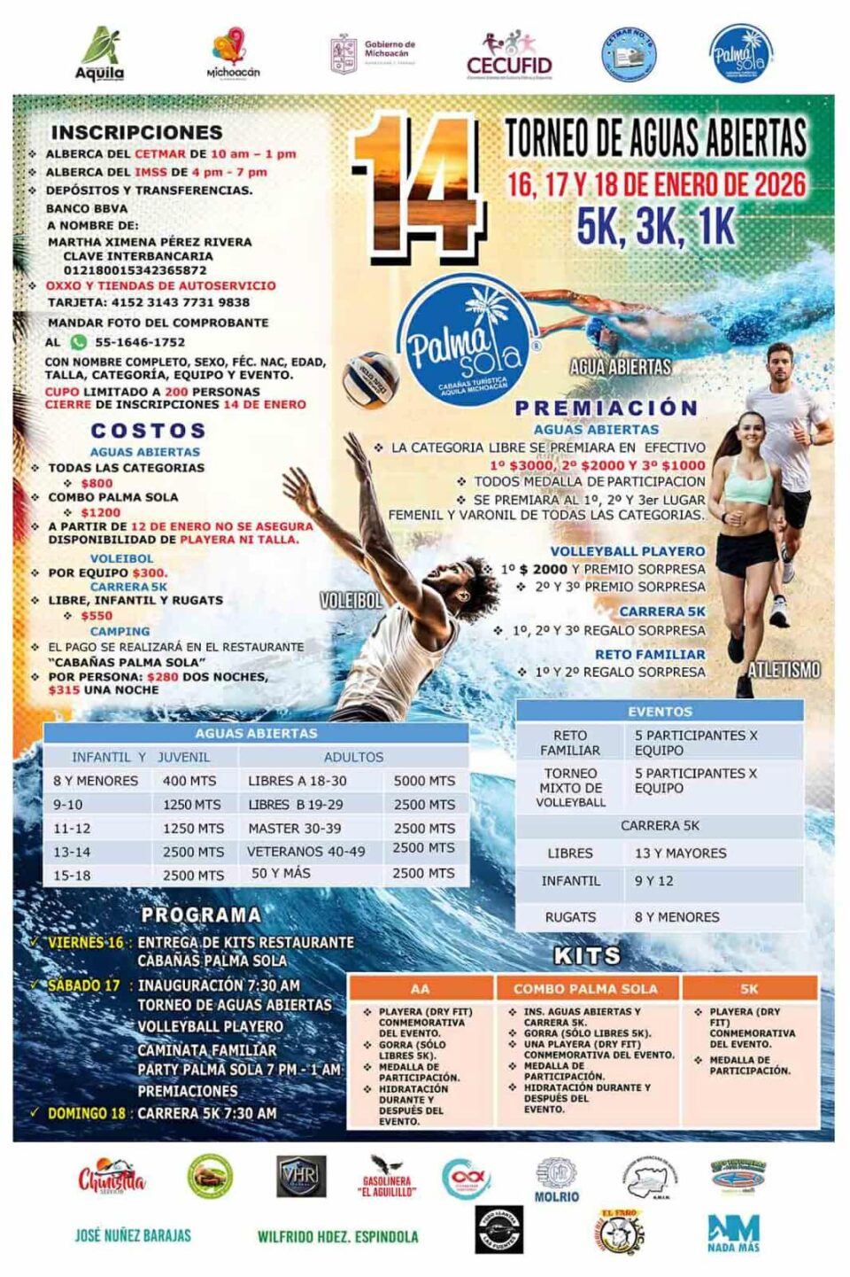 10 ENERO 2026.- El Torneo de natación de Aguas Abiertas 2026 está listo para realizarse del 16 al 18 de enero en la playa Palma Sola, ubicada en el municipio de Aquila.