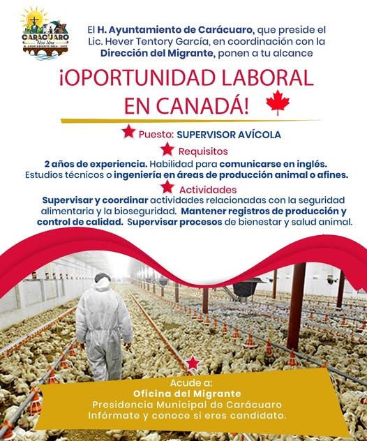 31 agosto 2025.-El H. Ayuntamiento de Carácuaro, que encabeza el Lic. Hever Tentory García, en coordinación con la Dirección del Migrante, abre una gran oportunidad laboral en Canadá 🇨🇦.