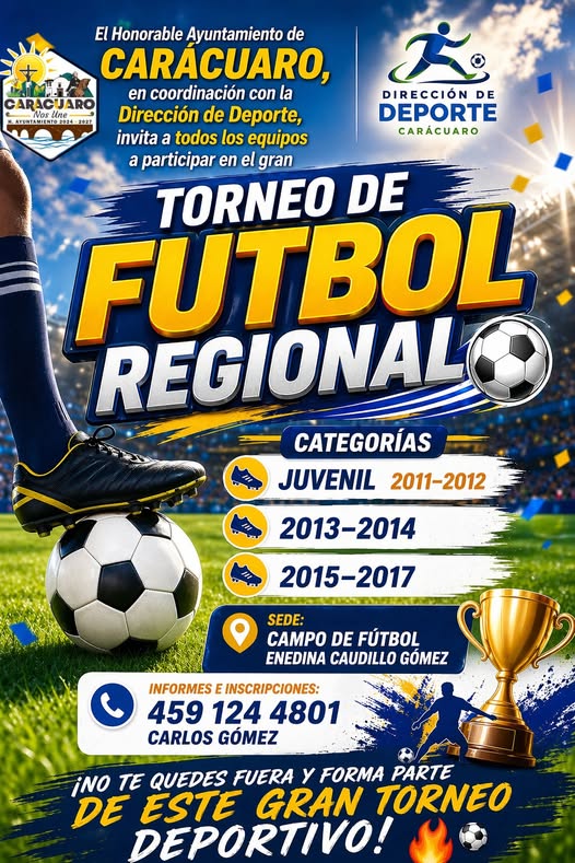 El Honorable Ayuntamiento de Carácuaro, en coordinación con la Dirección de Deporte, invita a todos los equipos a participar en el gran Torneo de Fútbol en las siguientes categorías: