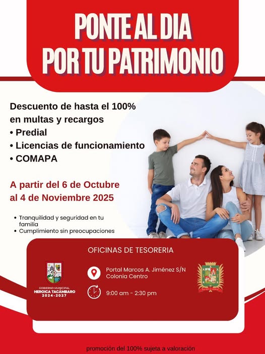 AYUNTAMIENTO DE TACAMBARO INVITA A CIUDADANOS PARA APROVECHAR DESCUENTOS EN EL COMAPA 1 OCT. 2025.-¡Ponte al día con lo que más importa: la seguridad de tu patrimonio! El H. Ayuntamiento invita a la ciudadanía a aprovechar el programa de descuento en recargos y multas hasta en un 100% en: Pago de Predial Licencias de funcionamiento Pago de Agua (COMAPA) Vigencia: Del 6 de octubre al 4 de noviembre 2025 Oficinas de Tesorería, Presidencia Municipal Horario: 9:00 am a 2:30 pm, de lunes a viernes Cumplir es cuidar de tu familia y de tu comunidad. ¡No dejes pasar esta oportunidad! #GobiernoCercano #CumpleConTacámbaro #TuPatrimonioSeguro #GobiernoMunicipalDeTacámbaro REDACCION