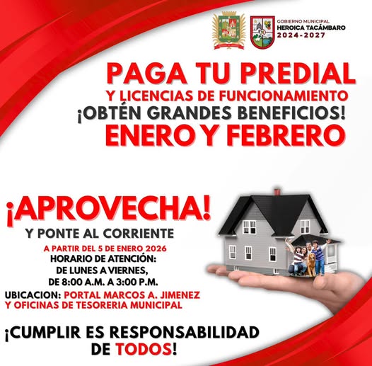 Durante enero y febrero, aprovecha los beneficios y ponte al corriente. Cada peso que aportas se traduce en mejores servicios, más obras y un Tacámbaro que sigue avanzando.
