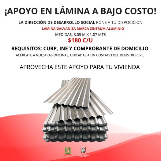 9 NOV. 2025.-El Gobierno Municipal de Tacámbaro a través de la Dirección de Desarrollo Social, pone a tu alcance lámina subsidiada a muy bajo costo, acércate a las oficinas a un costado del Registro Civil, y has tu registro.