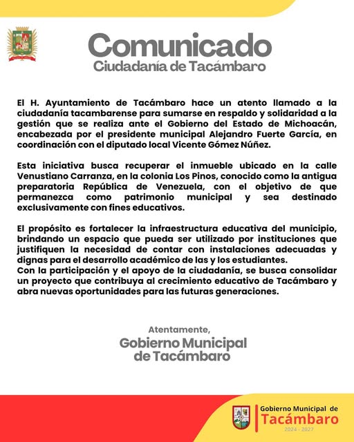Con la participación y el apoyo de la ciudadanía, se busca consolidar un proyecto que contribuya al crecimiento educativo de Tacámbaro y abra nuevas oportunidades para las futuras generaciones.