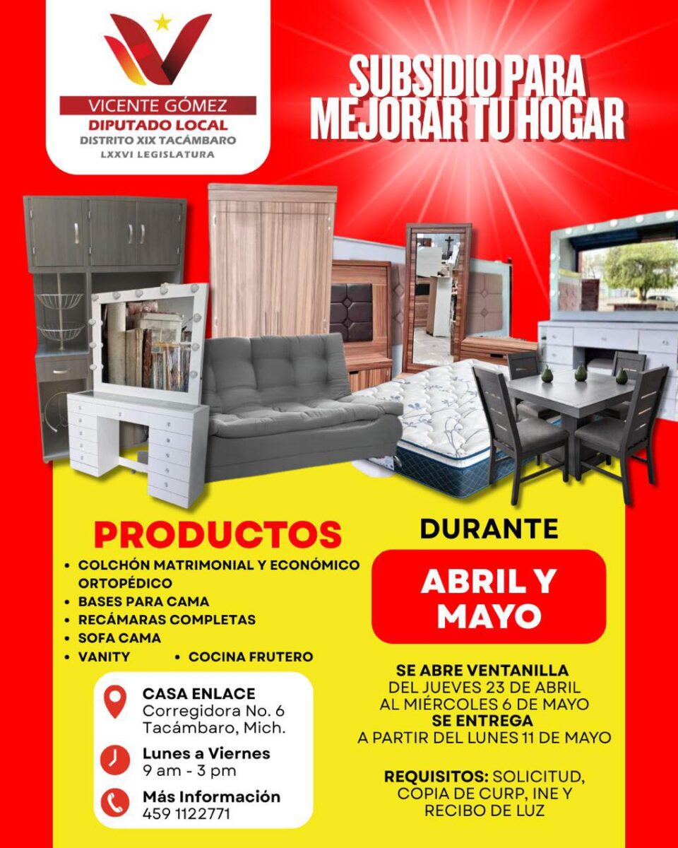 Añadimos más enseres. Acude a casa enlace a realizar tu solicitud: Corregidora No.6, en el centro de Tacámbaro, informó el diputado local Vicente Gómez Núñez.