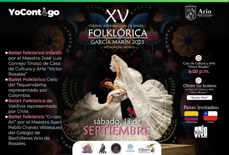11 SEPT. 2025.-El Gobierno de Ario, representado por la Mtra. Yohana Mendoza, a través de la Dirección de Cultura y el programa Ario Vivo, te invita a la XV edición del Festival de Danza Folklórica García Marín 2025.
