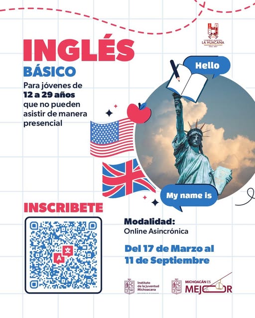 8 MARZO 2026.-El Instituto de la Juventud Michoacana, a través del Gobierno Municipal de La Huacana, hace llegar la invitación a las y los jóvenes del municipio para participar en la convocatoria de cursos de idiomas.