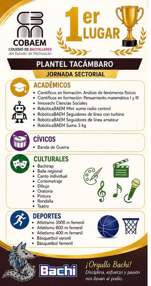 28 ABRIL 2026.-Nos complace compartir los extraordinarios resultados obtenidos por el Plantel Tacámbaro durante la reciente 42.ª Jornada Académica, Deportiva, Cívica y Cultural del COBAEM, en su fase sectorial con sede en Nocupétaro. Gracias al compromiso de nuestra comunidad, logramos destacar con: