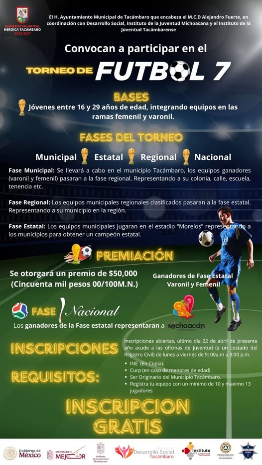 Se convoca a participar en el Torneo de Fútbol 7, dirigido a jóvenes de entre 16 y 29 años, en las ramas femenil y varonil, promoviendo la sana competencia, el trabajo en equipo y la representación de nuestras colonias, escuelas y comunidades.