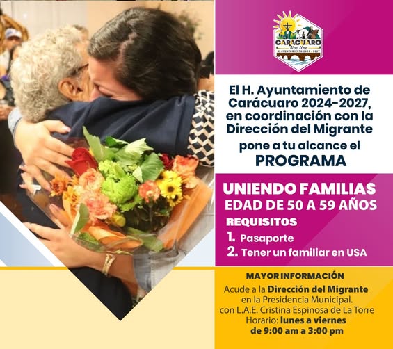 1 MARZO 2026.-El H. Ayuntamiento de Carácuaro, en coordinación con la dirección del Migrante, pone a disposición el programa “Uniendo Familias”, dirigido a personas de 50 a 59 años que desean reencontrarse con sus seres queridos en Estados Unidos