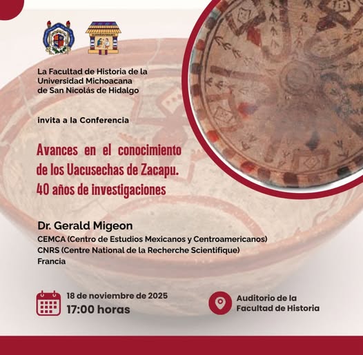 17 NOV. 2025.-El conocimiento sobre los Uacusechas de Zacapu será tema central en la conferencia que ofrecerá el Dr. Gerald Migeon, investigador del CEMCA y del CNRS de Francia, titulada “Avances en el conocimiento de los Uacusechas de Zacapu. 40 años de investigaciones”.