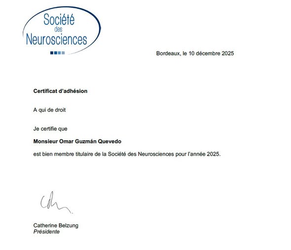 El Laboratorio de Neuronutrición Experimental e Ingeniería de Alimentos (Ingeniería en Industrias Alimentarias / Instituto Tecnológico Superior de Tacámbaro) felicita a nuestro Investigador líder, Dr. Omar Guzmán Quevedo, por su renovación como miembro de la “Société des Neurosciences” (Sociedad de las Neurociencias), la cual adhiere a los científicos en neurociencias más destacados de Francia.