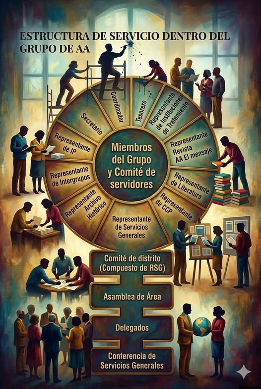 2026.-Basado en la estructura tradicional de Alcohólicos Anónimos y el diagrama que compartiste, la cantidad de servidores puede variar según el tamaño del grupo, pero existen roles fundamentales para que este funcione de manera autónoma y cumpla con su propósito.