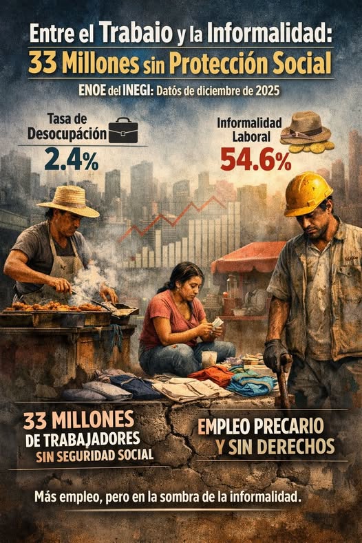11 feb. 2026.-La Encuesta Nacional de Ocupación y Empleo (ENOE), publicada por el Inegi el 26 de enero de 2026 con datos correspondientes a diciembre de 2025, confirma una realidad que no puede minimizarse: aunque la tasa de desocupación se mantiene en 2.4%, la informalidad laboral alcanzó 54.6% de la población ocupada, es decir, 33 millones de personas trabajan sin plena protección social.