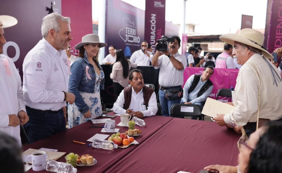 Acompañado por su gabinete legal y ampliado; del alcalde de Uruapan, Carlos Manzo; la diputada federal, Guadalupe Mendoza Arias; delegados federales; así como otras autoridades estatales y municipales, el mandatario recibió peticiones en materia de medio ambiente, agua, campo y movilidad, principalmente.