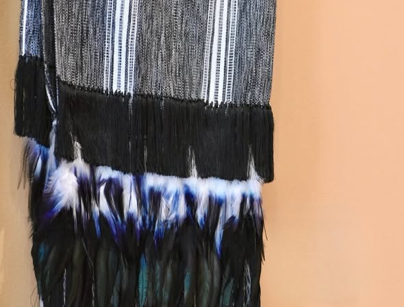 “Rebozo negro, gris y blanco con rapacejo de pluma”