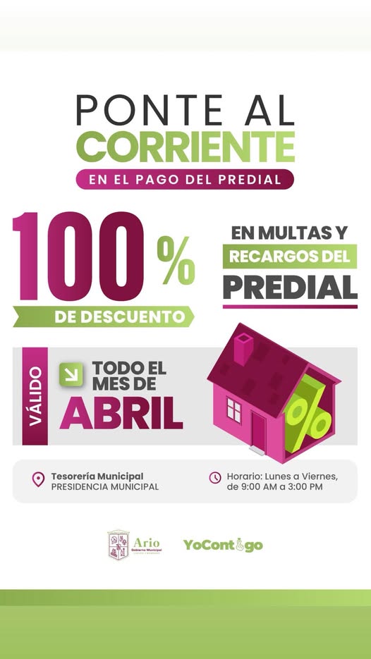 4 ABRIL 2026.-El Gobierno de Ario invita a la ciudadanía a aprovechar el 100% de descuento en multas y recargos del impuesto predial, vigente durante todo el mes de abril.