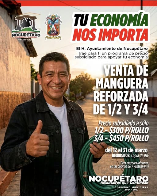14 MARZO 2026.-El Ayuntamiento de Nocupétaro 2024–2027, a través de la Dirección de Desarrollo Rural, pone a disposición de la ciudadanía el programa de venta de manguera reforzada subsidiada, una oportunidad pensada para apoyar la economía de nuestras familias y fortalecer las actividades del campo y del hogar.