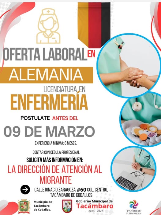 10 FEB. 2026.-El Gobierno Municipal a través de la dirección Atención del Migrante impulsa la oferta laboral en Alemania, dirigida a quienes cuentan con Licenciatura en Enfermería, abriendo puertas a mejores condiciones laborales, crecimiento profesional y una experiencia internacional que cambia vidas.