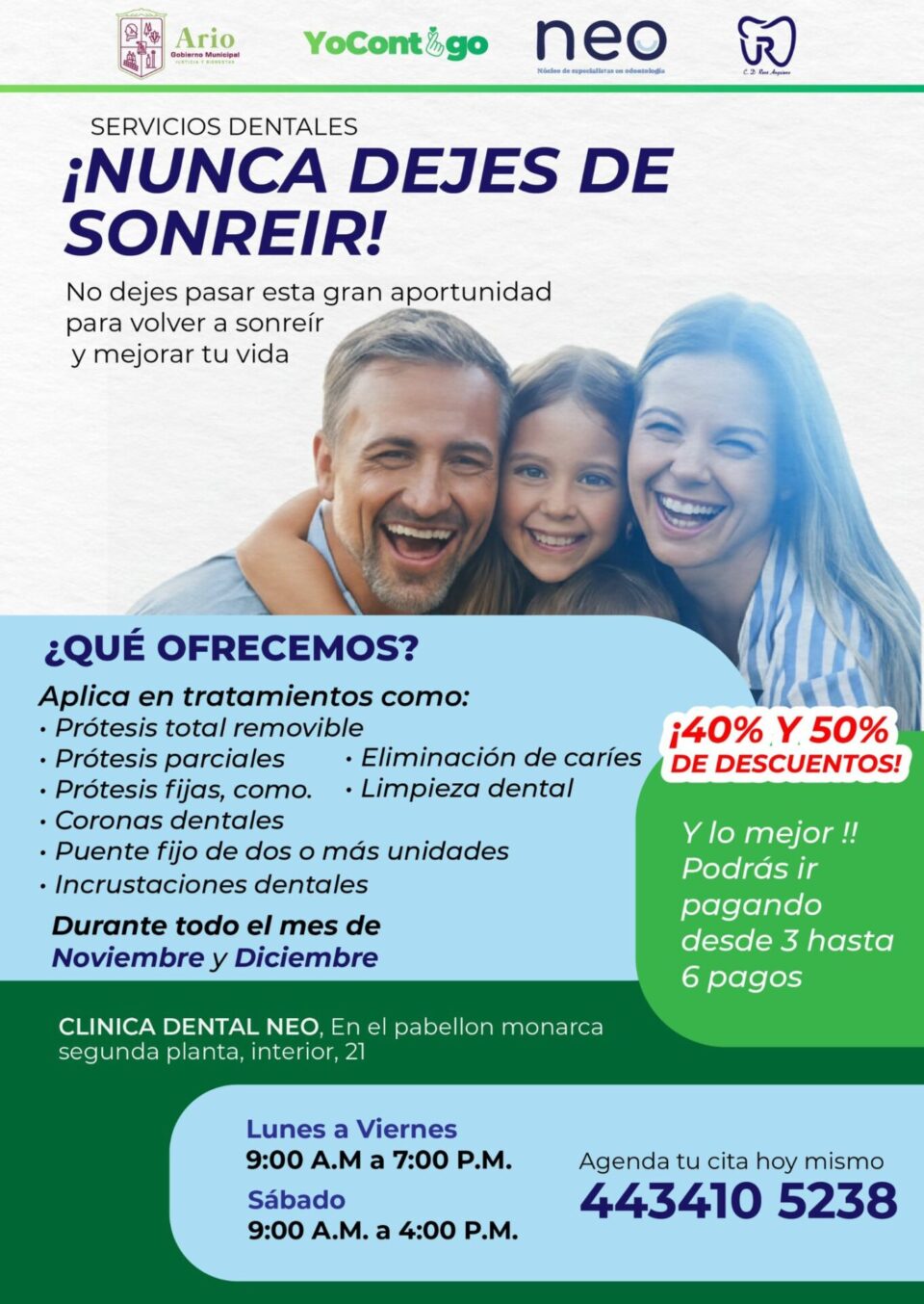 10 NOV. 2025.-El Gobierno de Ario, que encabeza la Presidenta Yohana Mendoza, en coordinación con la Clínica Dental NEO, impulsa la campaña “Nunca dejes de sonreír”, ofreciendo descuentos del 40% y 50% en distintos tratamientos odontológicos durante los meses de noviembre y diciembre.