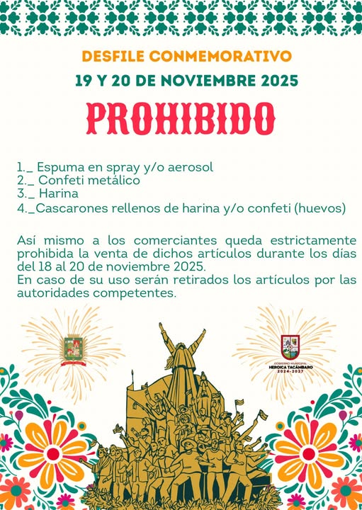 A las y los comerciantes: su apoyo es fundamental. Les recordamos que la venta de estos artículos estará prohibida del 18 al 20 de noviembre. Con su colaboración, hacemos de Tacámbaro un lugar más seguro y ordenado.