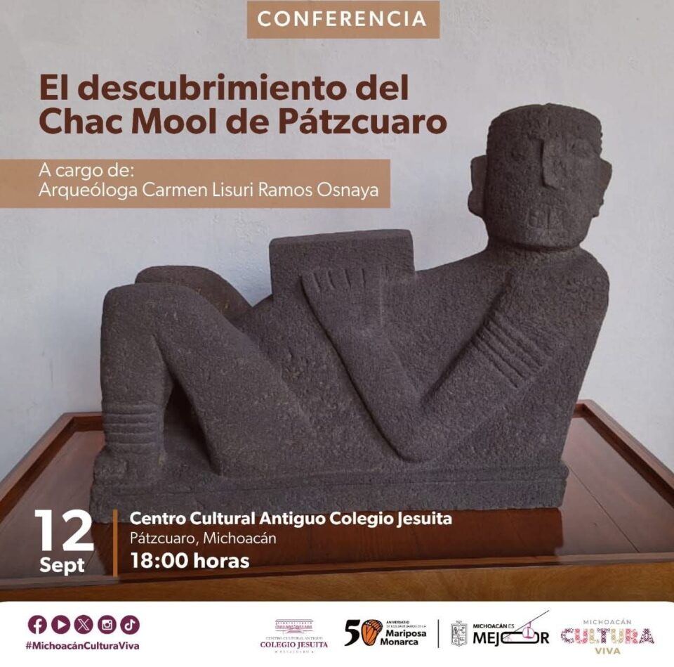 08 de septiembre de 2025.- Como parte de la agenda cultural de Michoacán, este 12 de septiembre se llevará a cabo la conferencia “El descubrimiento del Chac Mool de Pátzcuaro”, a cargo de la arqueóloga Carmen Lisuri Ramos Osnaya, en el Centro Cultural Antiguo Colegio Jesuita. La cita es a las 18:00 horas y estará abierta al público interesado.