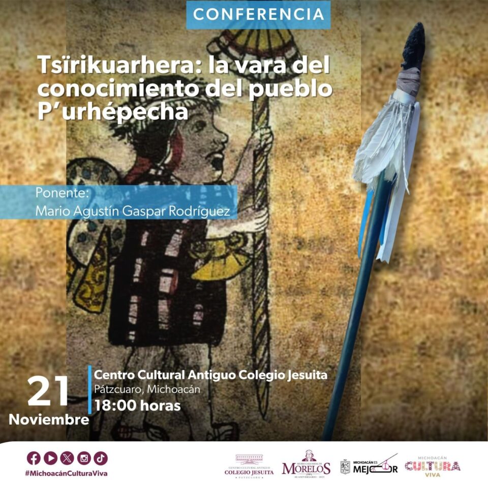 18 de noviembre de 2025. – El Centro Cultural Antiguo Colegio Jesuita invita al público en general a la conferencia “Tsïrikuarhera: la vara del conocimiento del pueblo P’urhépecha”, que será impartida por Mario Agustín Gaspar Rodríguez, una de las voces más reconocidas en la defensa de los saberes ancestrales p’urhépecha.