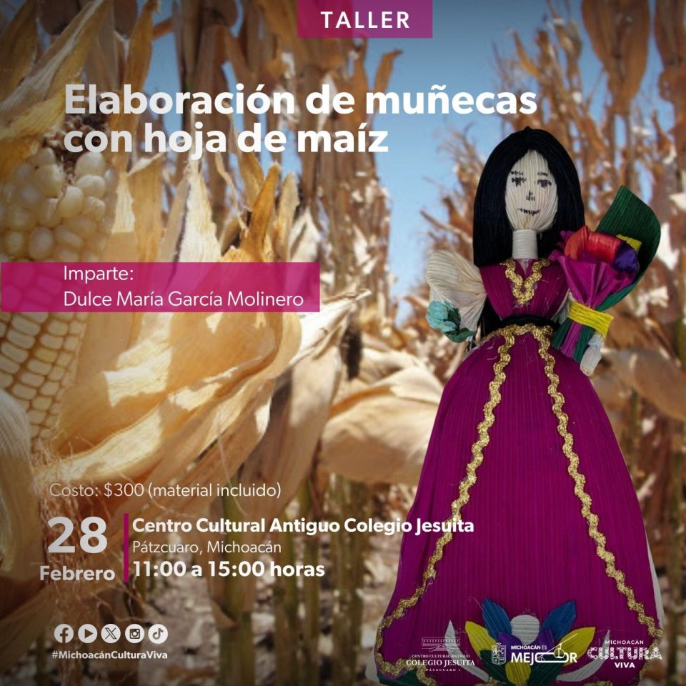 13 de febrero de 2026.-El Centro Cultural Antiguo Colegio Jesuita invita al taller: “Elaboración de muñecas con hojas de maíz”, una actividad que rescata saberes tradicionales y pone en valor el simbolismo del maíz en la cultura purépecha. La sesión será impartida por Dulce María García Molinero el próximo sábado 28 de febrero a las 11:00 horas, en el salón de usos múltiples 1 (planta baja), con una aportación de 300 pesos que incluye material.