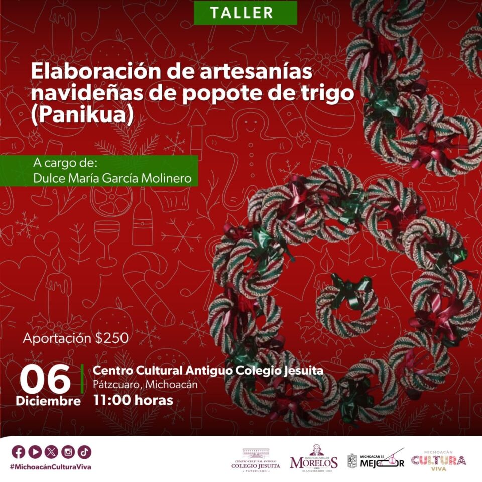 29 de noviembre de 2025.-El Centro Cultural Antiguo Colegio Jesuita anunció la realización del taller “Elaboración de Artesanías Navideñas de Popote de Trigo (Panikua)”, que será impartido por la maestra artesana Dulce María García Molinero, originaria de Tzintzuntzan y reconocida por su dedicación a preservar técnicas heredadas por generaciones.