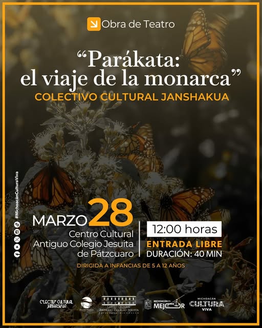 26 MARZO 2026.-Acompáñanos a la obra de teatro “Parákata: el viaje de la monarca” a cargo del colectivo cultural Janshakua, dirigido a infancias de 5 a 12 años y público en general.