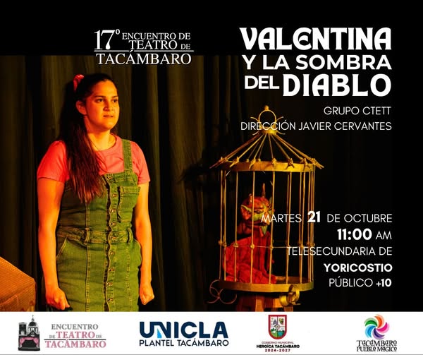 Este martes 21 de octubre estaremos presentando Valentina y la sombra del diablo en la Telesecundaria de Yoriscostio, obra de la Compañía Titular del Encuentro de Teatro de Tacámbaro.