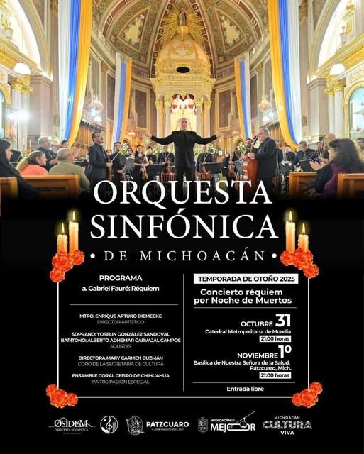 Se hace una invitación especial a disfrutar de una experiencia artística única y profundamente emotiva con el tradicional Concierto Réquiem por Noche de Muertos, interpretado magistralmente por la Orquesta Sinfónica de Michoacán (OSIDEM)