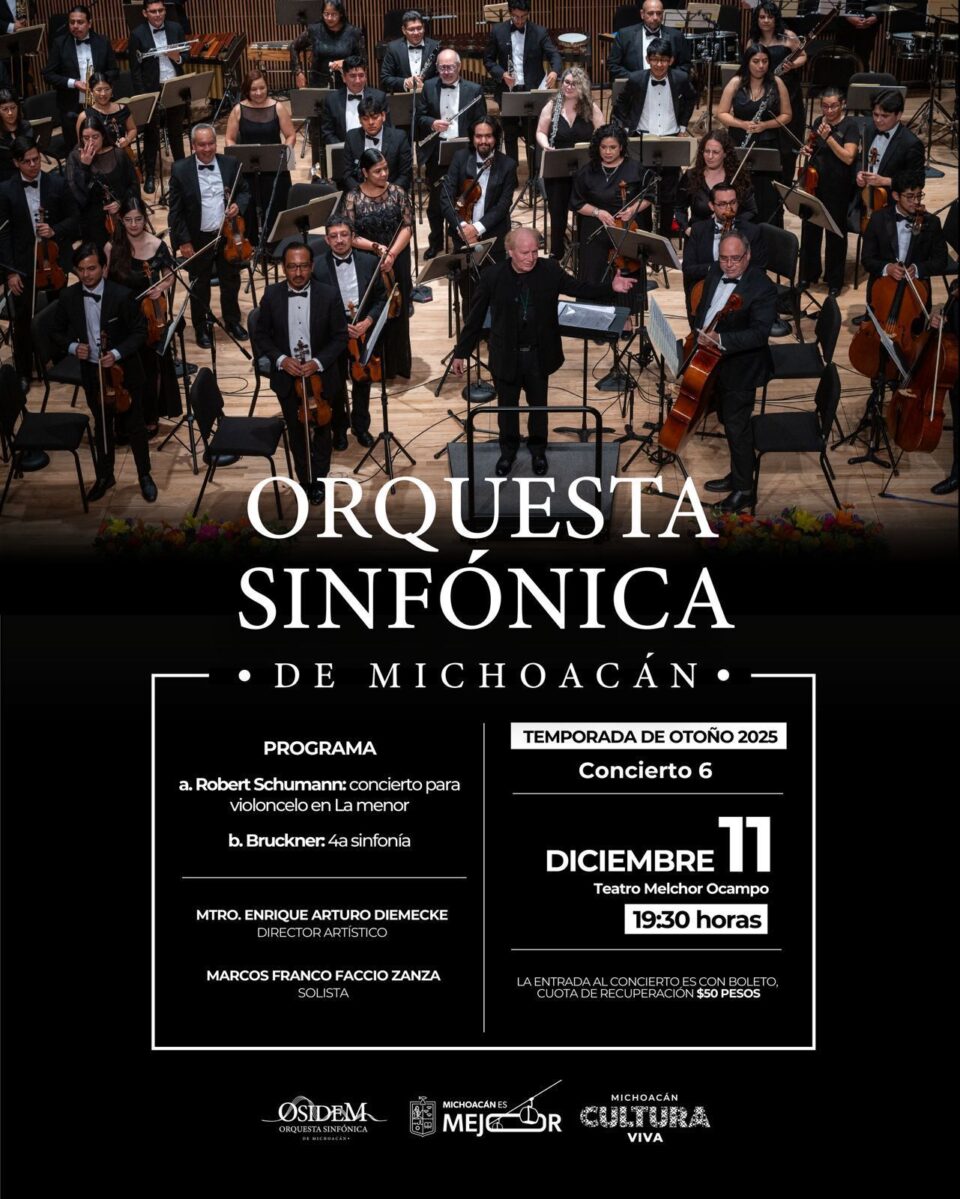 10 diciembre de 2025.- La Secretaría de Cultura de Michoacán (Secum) invita al sexto concierto de temporada de la Orquesta Sinfónica de Michoacán (Osidem), que se realizará este jueves 11 de diciembre a las 19:30 horas en el Teatro Melchor Ocampo. El programa contempla el Concierto para violonchelo en La menor de Robert Schumann y la Cuarta Sinfonía de Anton Bruckner.