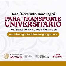 Finalmente hay que mencionar que la beca de apoyo para el transporte Gertrudis Bocanegra, que forma parte del Plan Michoacán por la Paz y la Justicia; “consistirá en apoyo para estudiantes universitarios hasta los 29 años, por $ 1,900 pesos que se entregan bimestralmente durante diez meses de cada ciclo escolar, por un máximo de 45 meses. En el caso de estudiantes de medicina, la beca podrá otorgarse hasta por 55 meses…”