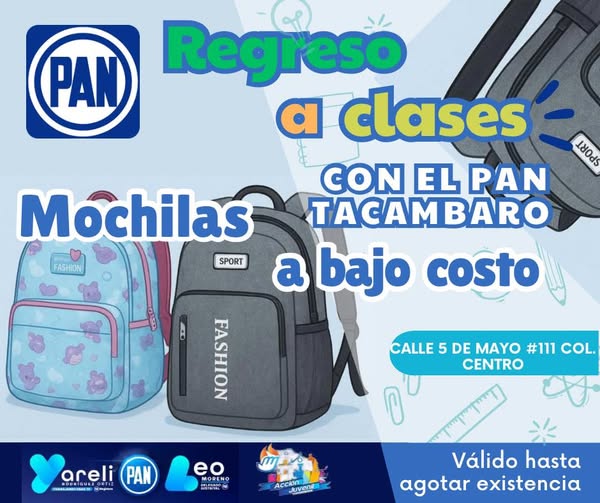 El Comité Directivo Municipal del Partido Acción Nacional tiene mochilas a bajo costo para este regreso a clases. 🏫📚