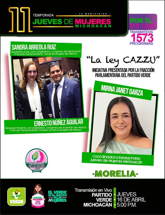 En la Temporada 11 de Jueves de Mujeres Michoacán, hablaremos de un tema clave: “La Ley CAZZU”, una iniciativa impulsada por la fracción parlamentaria del Partido Verde.