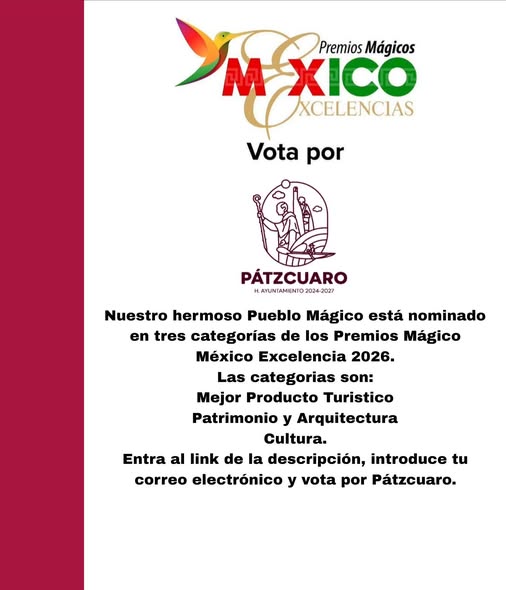 Pátzcuaro brilla en los Premios Mágico México Excelencia 2026 11 ABRIL 2026.-Estamos emocionados de anunciar que Pátzcuaro está nominado. Tu voto cuenta y puede hacer la diferencia. Las categorías son: Mejor Producto Turístico Patrimonio y Arquitectura Cultura. Vota aquí: https://docs.google.com/…/1FAIpQLScYQa…/alreadyresponded Tienes hasta el 14 de abril para participar. ¡Hagamos que Pátzcuaro sea el ganador! #Pátzcuaro #CulturayOportunidades