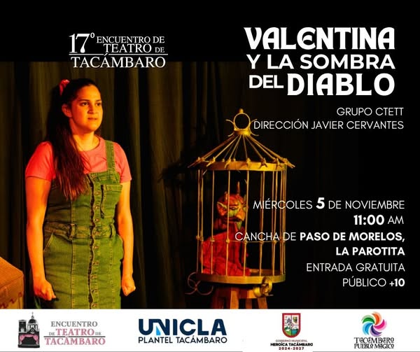 Este miércoles 5 de noviembre estaremos presentando VALENTINA Y LA SOMBRA DEL DIABLO en la cancha de Paso de Morelos (La Parotita) a las 11 de la mañana.