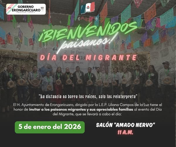 30 DIC. 2025.-El H. Ayuntamiento de Erongarícuaro, encabezado por la L.E.P. Liliana Campos de la Luz, a través de la Dirección del Migrante, hace la cordial invitación a la comunidad migrante del municipio a acompañarnos el día 5 de Enero en punto de las 11 AM al evento con motivo del Día del Migrante, que se llevará a cabo en el Salón Amado Nervo.