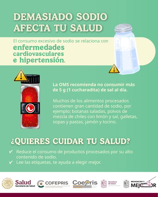 Recuerda, consume sólo máximo 5 gramos (1 cucharadita) al día. ¡Reduce procesados y lee las etiquetas! Ahí se esconde el sodio.