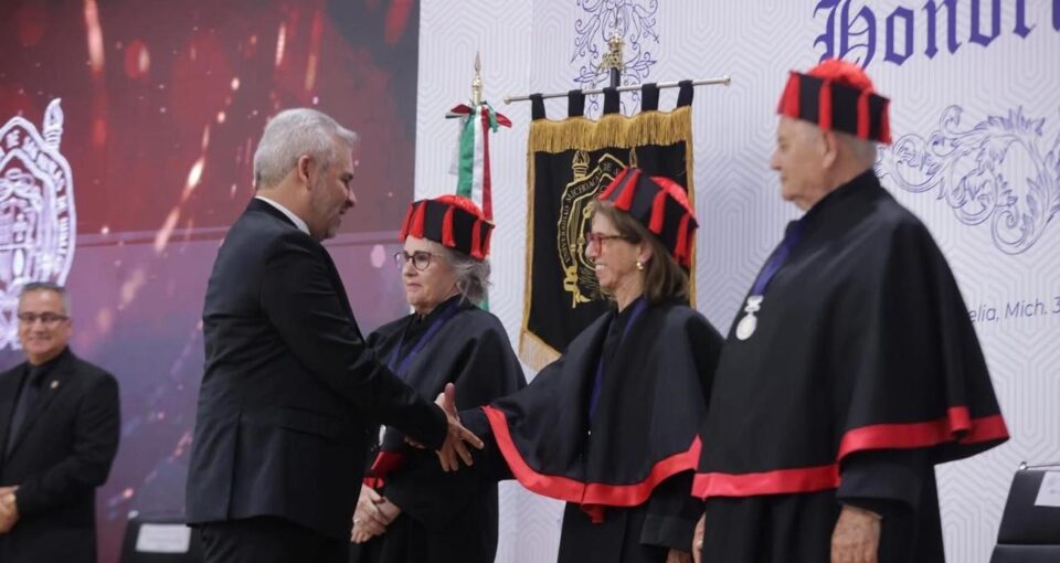 1 de noviembre de 2025.-* El gobernador Alfredo Ramírez Bedolla asistió a la ceremonia de investidura donde la Universidad Michoacana de San Nicolás de Hidalgo (UMSNH) distinguió con el doctorado “honoris causa” a Catherine Rose Ettinger Mc Enulty, Annie Pardo Cemo y Gerardo Sánchez Díaz.