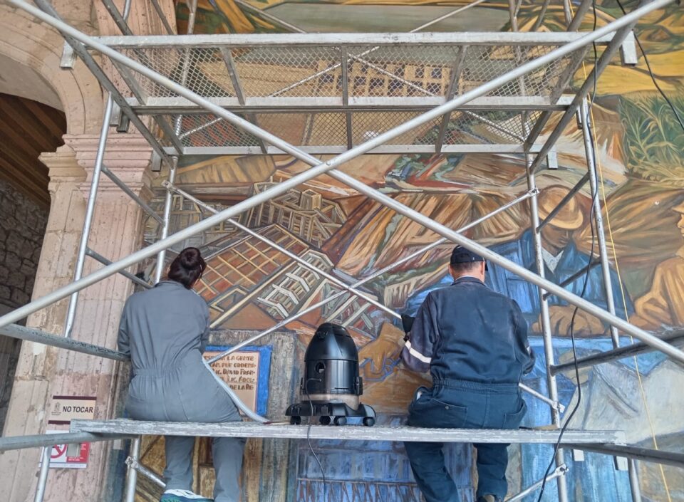 El trabajo inició con una limpieza en seco, retiro de polvo, telarañas y tizne con aspiradora de cepillo suave y brochas de cerda natural, en los 160 metros cuadrados de superficie, incluidas pilastras y cornisas de cantera. Posteriormente, se aplicó una limpieza húmeda que permitió eliminar sales y suciedad oleosa en la parte baja del mural.