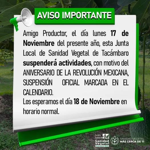 La Junta Local de Sanidad Vegetal de Tacรกmbaro informa a todos los productores que ๐๐ฅ ๐๐ขฬ๐ ๐ฅ๐ฎ๐ง๐๐ฌ ๐๐ ๐๐ ๐ง๐จ๐ฏ๐ข๐๐ฆ๐๐ซ๐ ๐๐ ๐๐๐๐ ๐ฌ๐ ๐ฌ๐ฎ๐ฌ๐ฉ๐๐ง๐๐๐ซ๐ฬ๐ง ๐ฅ๐๐ฌ ๐๐๐ญ๐ข๐ฏ๐ข๐๐๐๐๐ฌ con motivo del aniversario de la Revoluciรณn Mexicana, suspensiรณn oficial marcada en el calendario.