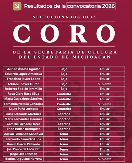 SE INTEGRAN NUEVAS VOCES AL CORO DE LA SECRETARIA DE CULTURA ¡Bienvenidas las nuevas voces que a partir de hoy se integran a nuestro #Coro! Su talento, disciplina y pasión fortalecerán aún más el legado artístico de esta gran institución. ¡Felicidades a todas y todos los seleccionados! #MichoacánCulturaViva