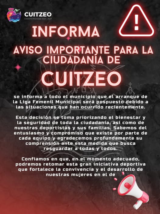 Por parte del Ayuntamiento de Cuitzeo, se informa a todo el municipio que el arranque de la Liga Femenil Municipal será pospuesto debido a las situaciones que han ocurrido recientemente.